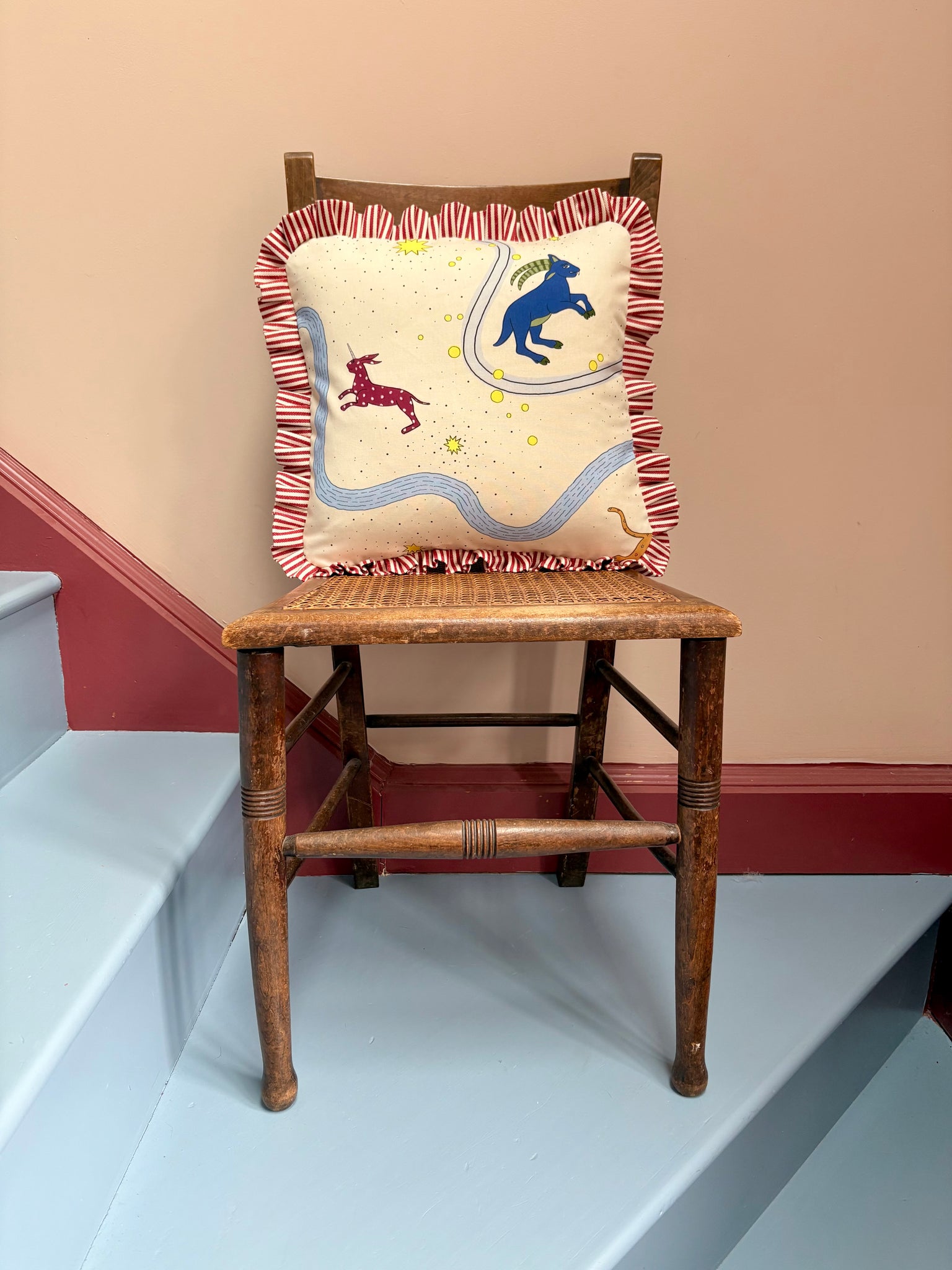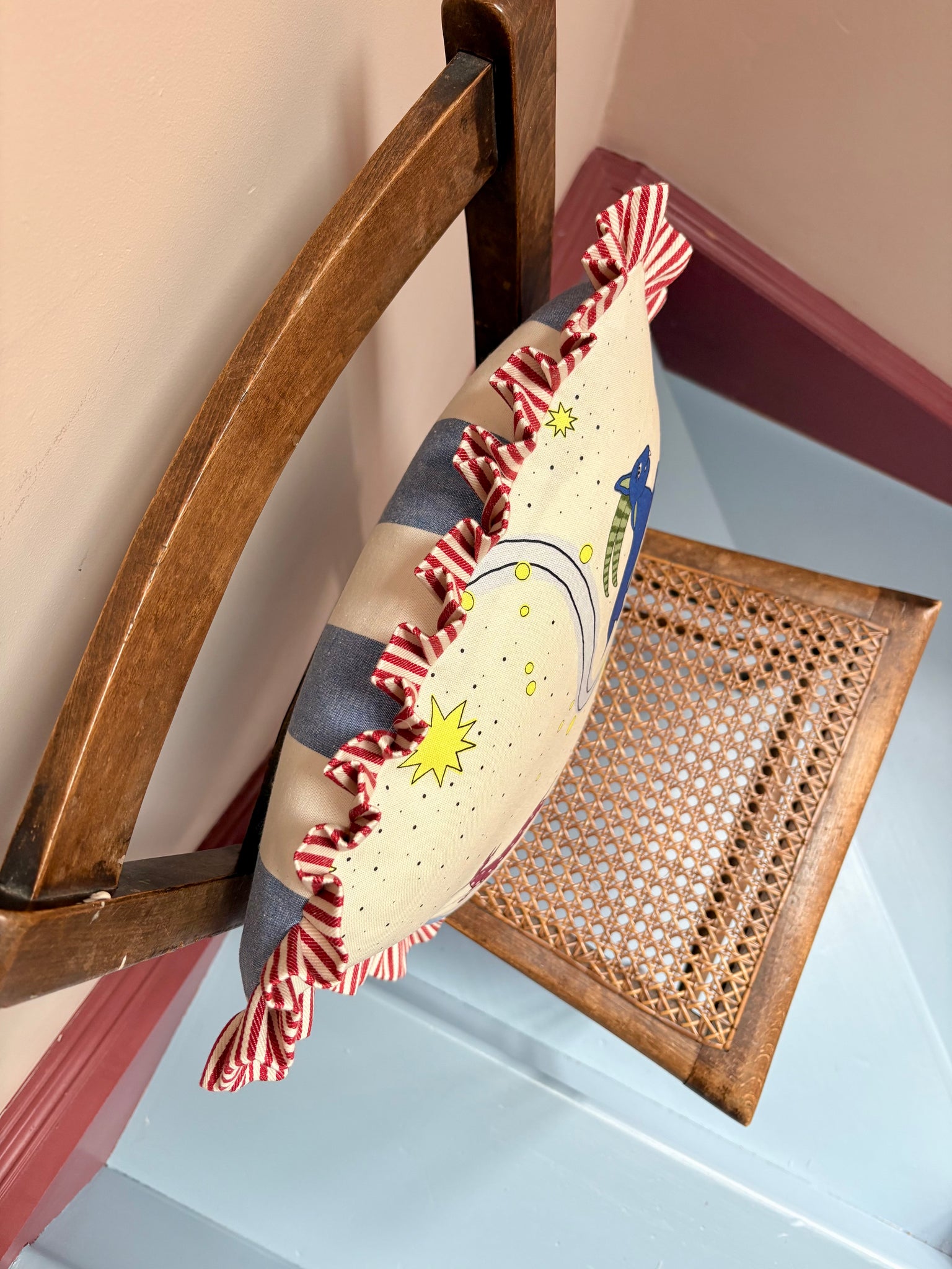 I've paired this one with a red candy stripe frill and blue wide stripe back - what a cracker!! The perfect size for a small chair, or to sit amongst friends on a sofa.