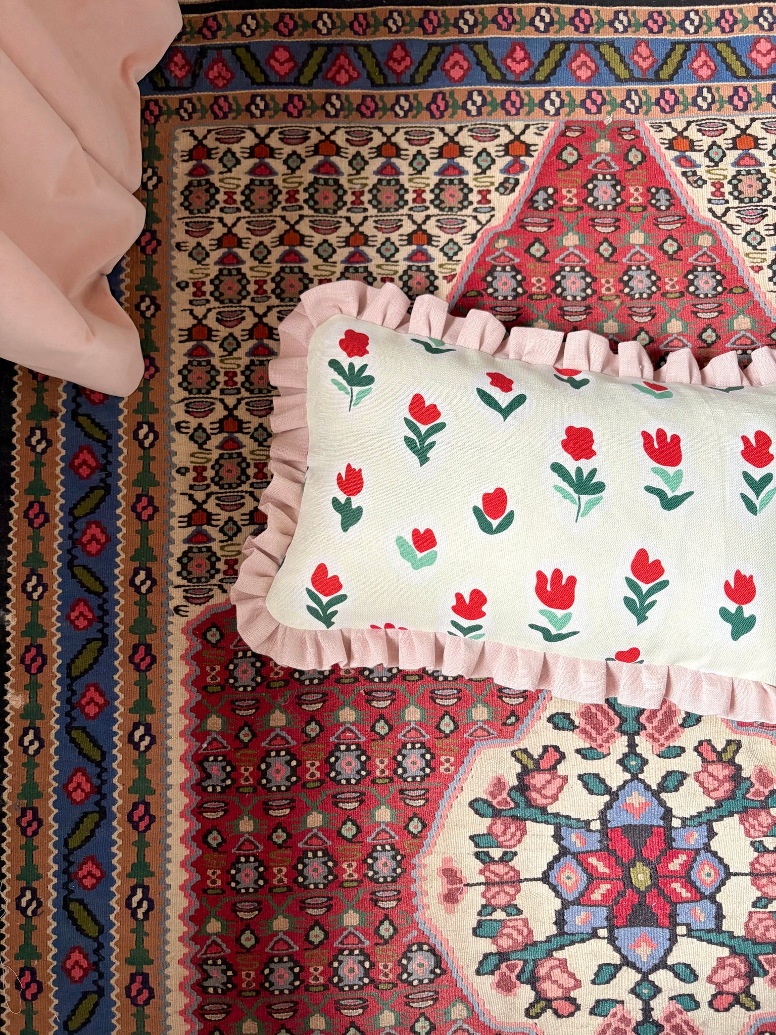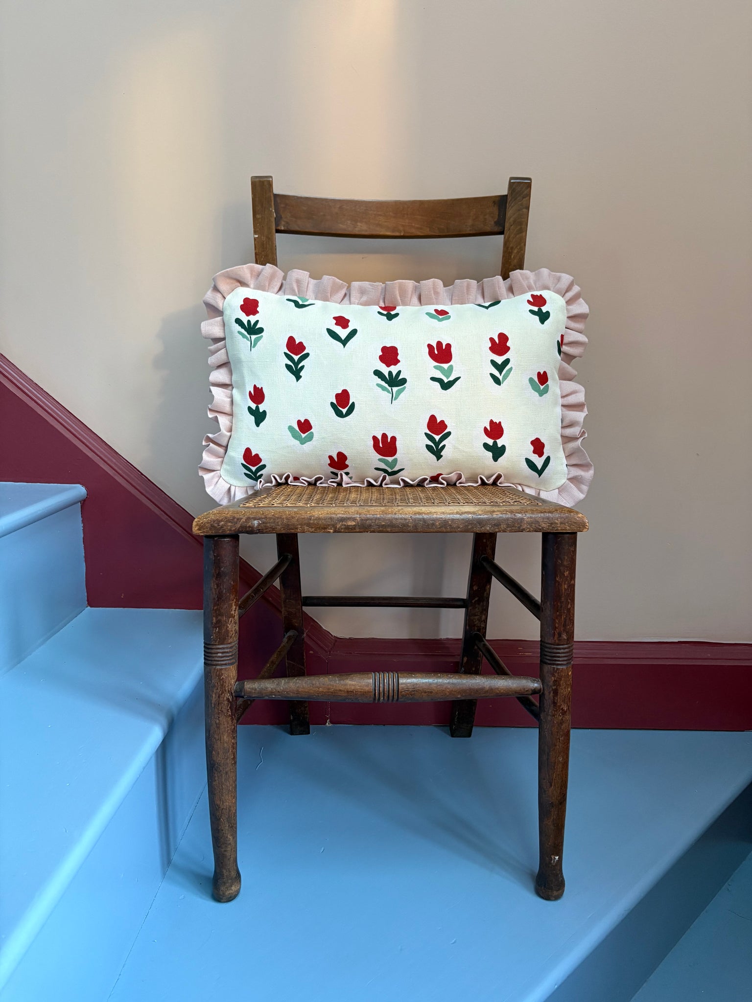These are paired with a pale pink frill and sage green candy stripe back. They would be perfect in a bedroom surrounded by other pinks and greens, or also on a large sofa paired with some blues and reds as well.