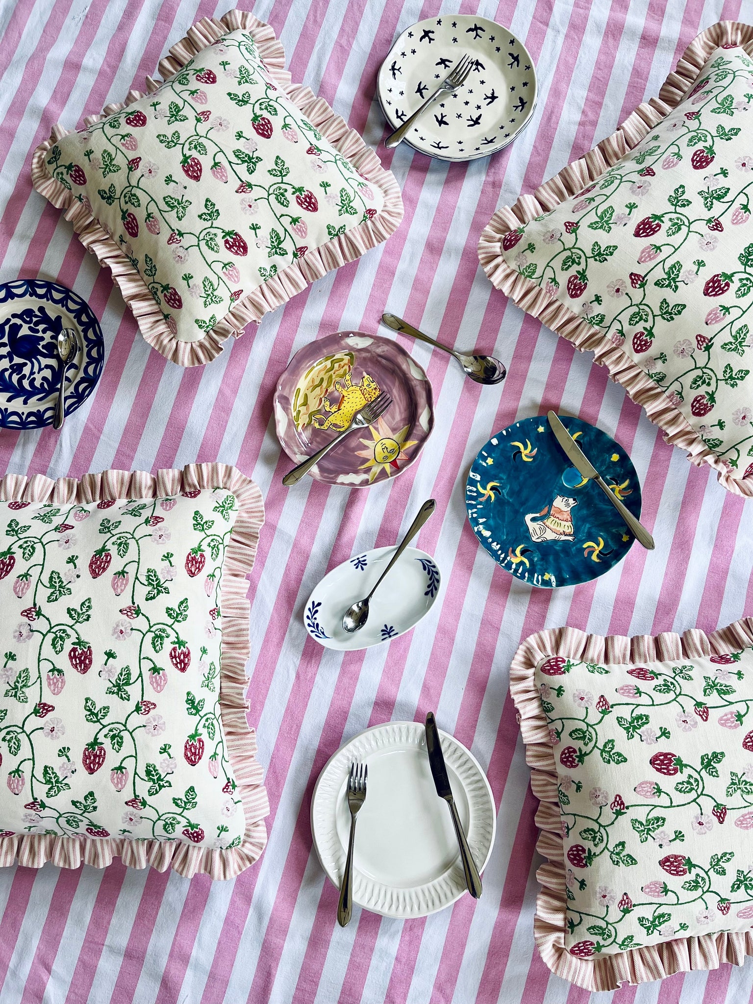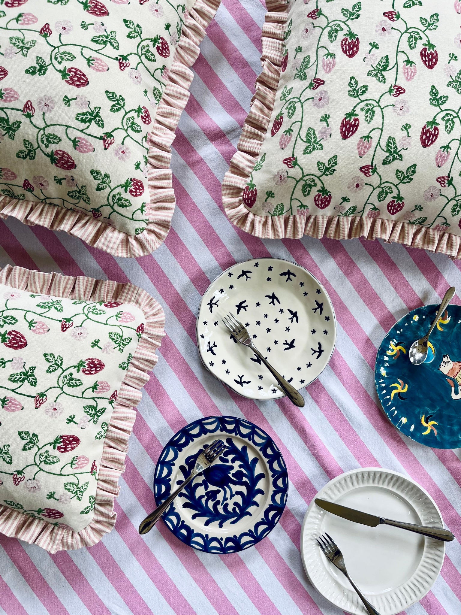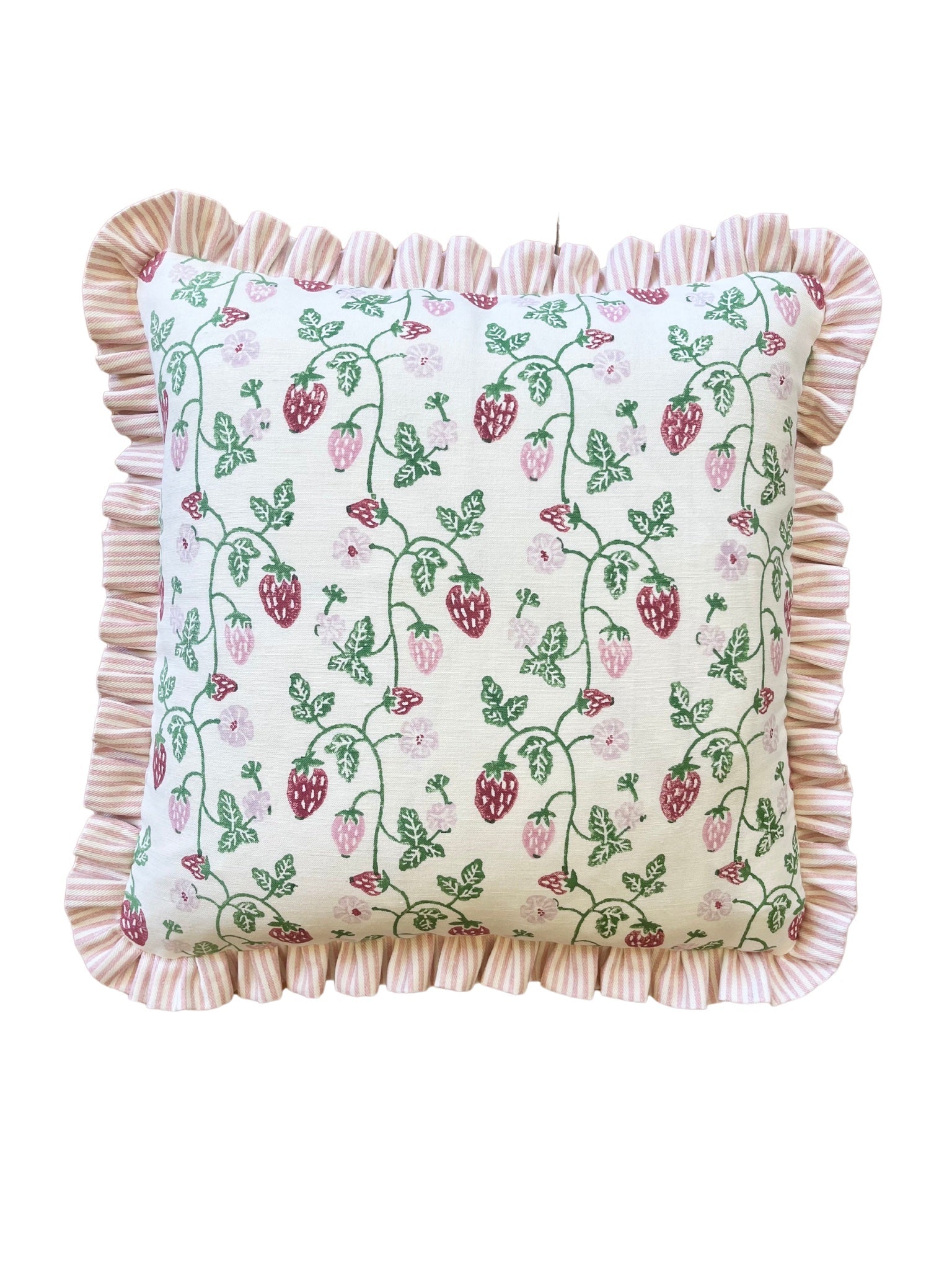 This is just pure happiness in a cushion!! The strawberry print fabric is from Molly Mahon, and I think you'll agree it is a real cracker!!! I really love it with a pink stripe frill, but is also so amazing with a pale blue frill, red candy stripe frill and also green!